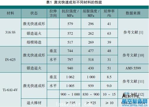 美国首先于1995年提出高性能金属零件的激光快速成形技术,在能源部研究计划支持下,Sandia及Los Alomos国家实验室率先发展出称为LENS(Laser Engineered Net Shaping)[4]及DLF(Directed Light Fabrication)[5]的技术,研究了不锈钢、镍基合金、钛合金、难熔金属等材料的组织及性能,并采用该技术成功制造出铼及铱的喷管[6],显示出该技术在高性能金属零件直接成形方面的优势,并于1998年由Optomec公司成功推出商业化的LENS系统。随后美国的Stanford University、University of Michigan、英国的University of Birmingham、University of Manchester、University of Liverpool及加拿大的National Research Council等也发展了分别称作为SDM(Shape Deposition Manufacturing)、DMD(Direct Metal Deposition)、DLF(Direct Laser Fabrication)、DLD(Direct Laser Deposition)、LDC(Laser Direct Casting)、LC(Laser Consolidation)的技术[7-11],尽管各自的名称不同,但原理和方法是一致的,系统所配备的激光器主要有CO2气体激光器、Nd:YAG固体激光器及光纤激光器,所成形的材料包括各种不锈钢、镍基合金、钛合金等。相关研究表明,激光快速成形的金属零件具有致密、细小的组织,成分均匀,力学性能达到或超过锻件水平[10-12],表1为激光快速成形不同材料的力学性能。