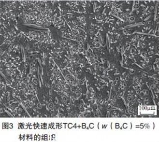 利用激光熔池内的原位冶金反应,可以实现原位复合材料的制备与成形。Fraser教授领导的研究组通过激光熔化沉积TC4合金粉和B粉制备了TiB增强的钛基复合材料,TiB的尺寸十分细小、分布均匀,但未见关于所制备材料性能的报道[28-29]。通过激光熔化沉积TA15与B4C的混合粉,制备出不同TiB+TiC含量的原位复合材料,结果表明,增强相体积分数约9%的复合材料表现出较好的综合力学性能[30],当增强体含量较高时,材料的力学性能反而变差。图3为激光快速成形TC4+B4C(w(B4C)=5%)所制备原位钛基复合材料的内部组织,材料中较为粗大的原位析出相(TiB)严重影响了复合材料性能的提高。Liu等通过将TC4基体预热至500℃,避免了激光快速成形Ti-48Al-2Cr-2Nb+TiC复合材料时开裂的发生[31]。为发展具有良好性能的原位复合材料,需要合理选择原位反应的材料体系,加强对熔池的温度、停留时间的控制,实现对增强体的形态、大小及分布等的控制,同时需要解决成形开裂的问题。