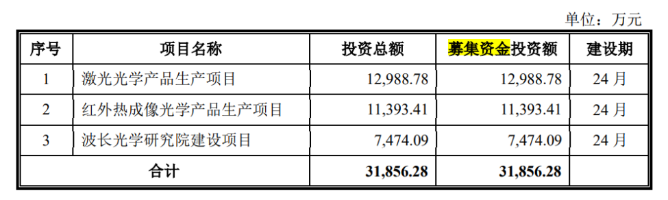 据招股说明书的信息披露,波长光电拟募资3.19亿元用于激光光学产品生产项目、红外热成像光学产品生产项目和波长光学研究院建设项目。