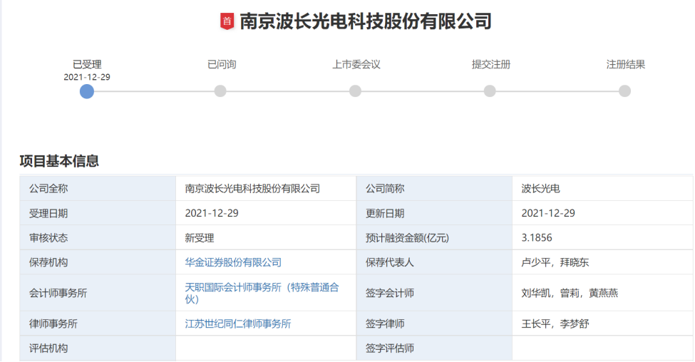 12月29日,南京波长光电科技股份有限公司申请在创业板上市已获受理。华金证券股份有限公司为其保荐机构。