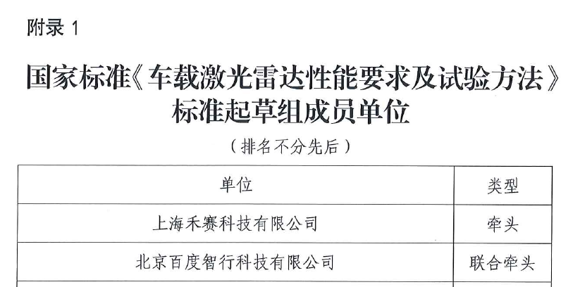 在国家标准方面,上海禾赛科技有限公司(以下简称“禾赛科技”)作为牵头单位,百度作为联合牵头单位,共同负责国标GB/T《车载激光雷达性能要求及试验方法》的制定。禾赛科技和百度分别作为激光雷达和自动驾驶行业的领导者,将协同三十余家行业领先企业和机构,一起推动我国车载激光雷达标准的落地工作。