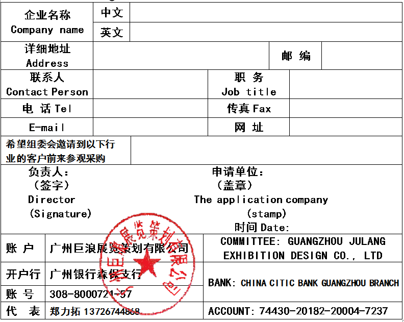 备注:本表仅为企业申请报名所用,正式展位必须在报名三天内,汇出参展费用并传真银行汇款单后,我司回传展位确定书为准,否则,展位给予撤销.