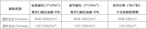注:标准展位(3m×3m),包括三面围板、楣板、洽谈桌、两把椅子、垃圾篓、220V/5A电源插座、照明费、清洁费等。空地不包括任何配套设施,需按规定向展馆缴纳施工管理费展台电源需另行租用。(详见《参展商手册》)