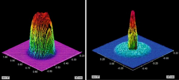 图2. 光束截面的能量分布。右侧是普通单光源光束ϕ100 μm,左侧是二合一激光的光束质量。