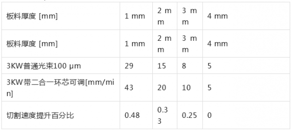 表3. 3KW带二合一环芯可调和4kw普通光束切割的速度对比。测试设备是TruLaser Cell 8030 3KW