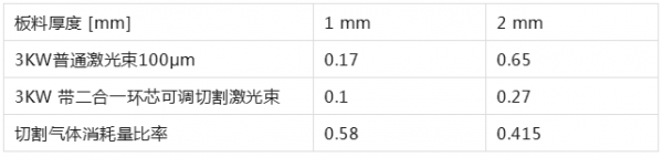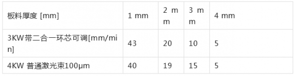表2. 3KW带二合一环芯可调和4kw普通光束切割二维平板的速度对比。测试设备是TruLaser Cell 8030