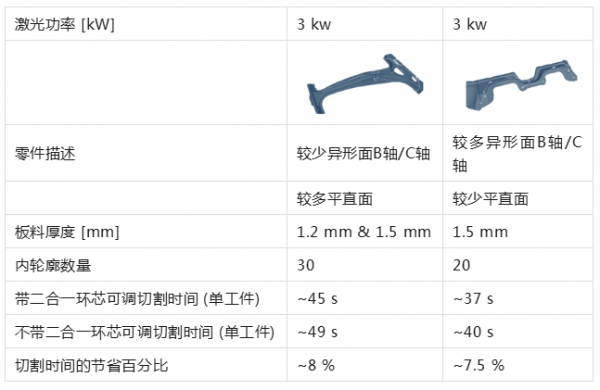 表1. 二合一环芯可调切割二维平板时间数据对比。测试设备是TruLaser Cell 8030