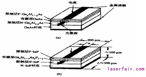 这种结构由三层不同类型半导体材料构成,不同材料发射不同的光波长。图中标出所用材料和近似尺寸。结构中间有一层厚0.1~0.3 μm的窄带隙P型半导体,称为有源层;两侧分别为宽带隙的P型和N型半导体,称为限制层。三层半导体置于基片(衬底)上,前后两个晶体解理面作为反射镜构成法布里 - 珀罗(FP)谐振腔。