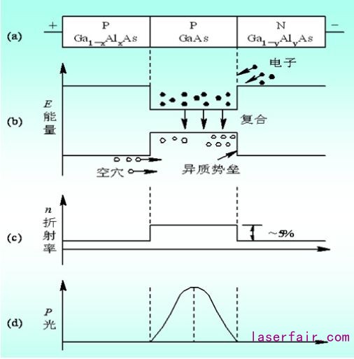 (a) 双异质结构;(b) 能带;(c) 折射率分布;(d) 光功率分布