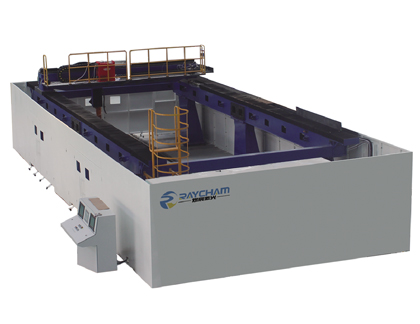 龙门三维焊接系统集成了激光器、水冷机、倒挂机器人、移动龙门架机构、焊缝跟踪系统、焊烟净化器等设备,系统共有9个伺服电机,机器人6轴+龙门架移动(X1/X2/Y)。机器人倒挂形式安装在龙门架机构横梁上,可沿横向(Y方向)移动,整体沿纵向(X方向)移动,激光焊接头及焊缝跟踪系统集成安装在机器人末端,以实现4m×10m范围内的有效焊接。