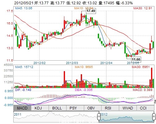 今 开: 13.77 成交量: 17495手 振 幅: 6.12% 最 高: 13.77 成交额: 2308.70万 换手率: 10.29% 最 低: 12.92 总市值: 8.72亿 市净率: 2.81 昨 收: 13.90 流通...