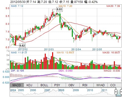 今 开: 7.14 成交量: 87157手 振 幅: 1.11% 最 高: 7.20 成交额: 6234.80万 换手率: 0.92% 最 低: 7.12 总市值: 74.67亿 市净率: 2.51 昨 收: 7.18 流通市值...