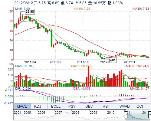 今 开: 6.81 成交量: 57831手 振 幅: 1.31% 最 高: 6.89 成交额: 3958.14万 换手率: 0.61% 最 低: 6.80 总市值: 71.65亿 市净率: 2.41 昨 收: 6.85 流通市值...