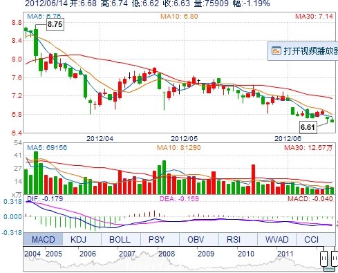 今 开: 6.68 成交量: 75908手 振 幅: 1.79% 最 高: 6.74 成交额: 5075.26万 换手率: 0.80% 最 低: 6.62 总市值: 69.24亿 市净率: 2.33 昨 收: 6.71 流通市值...