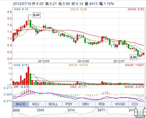 今 开: 6.05 成交量: 9413手 振 幅: 3.62% 最 高: 6.21 成交额: 577.24万 换手率: 0.34% 最 低: 5.99 总市值: 17.50亿 市净率: 2.80 昨 收: 6.07 流通市值: ...