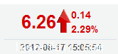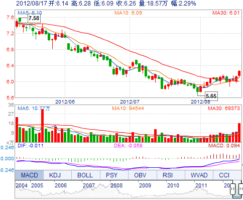 今 开: 6.14 成交量: 185710手 振 幅: 3.10% 最 高: 6.28 成交额: 11544.36万 换手率: 1.96% 最 低: 6.09 总市值: 65.38亿 市净率: 2.20 昨 收: 6.12 流通市...