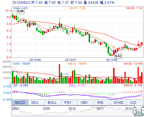 今 开: 7.45 成交量: 24437手 振 幅: 3.75% 最 高: 7.65 成交额: 1829.69万 换手率: 1.26% 最 低: 7.37 总市值: 15.22亿 市净率: 3.11 昨 收: 7.46 流通市值...