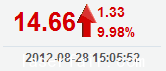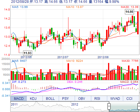 今 开: 13.17 成交量: 13164手 振 幅: 11.18% 最 高: 14.66 成交额: 1880.84万 换手率: 3.95% 最 低: 13.17 总市值: 9.82亿 市净率: 3.15 昨 收: 13.33 流通...