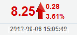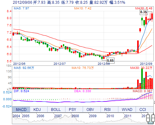 今 开: 7.93 成交量: 829155手 振 幅: 7.03% 最 高: 8.35 成交额: 67701.33万 换手率: 8.77% 最 低: 7.79 总市值: 86.16亿 市净率: 3.07 昨 收: 7.97 流通市...