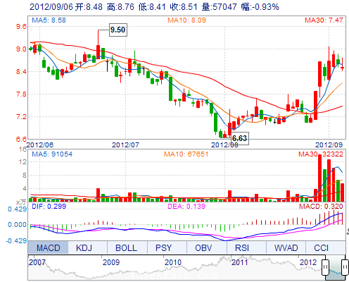 今 开: 8.48 成交量: 57047手 振 幅: 4.07% 最 高: 8.76 成交额: 4877.45万 换手率: 2.94% 最 低: 8.41 总市值: 16.96亿 市净率: 3.46 昨 收: 8.59 流通市值...