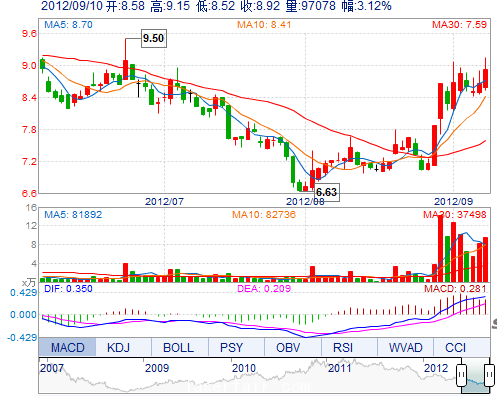 今 开: 8.58 成交量: 97078手 振 幅: 7.28% 最 高: 9.15 成交额: 8590.20万 换手率: 5.00% 最 低: 8.52 总市值: 17.77亿 市净率: 3.63 昨 收: 8.65 流通市值...