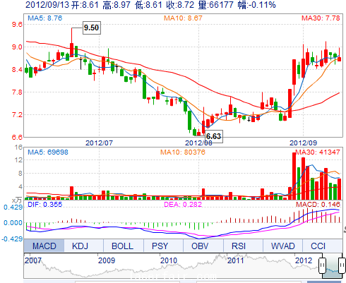 今 开: 8.61 成交量: 66176手 振 幅: 4.12% 最 高: 8.97 成交额: 5837.91万 换手率: 3.41% 最 低: 8.61 总市值: 17.37亿 市净率: 3.54 昨 收: 8.73 流通市值...