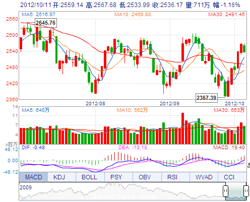 今 开: 2559.14 最 高: 2567.68 最 低: 2533.99 振 幅: 1.31% 昨 收: 2565.98 成交量: 7107097手 成交额: 730762.53万 换手率: --