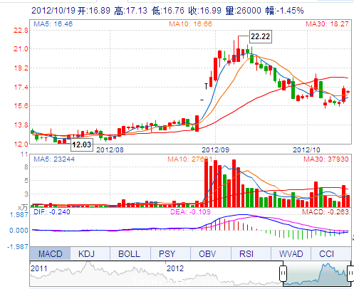 今 开: 16.89 成交量: 26000手 振 幅: 2.15% 最 高: 17.13 成交额: 4402.98万 换手率: 7.81% 最 低: 16.76 总市值: 11.38亿 市净率: 3.65 昨 收: 17.24 流通...
