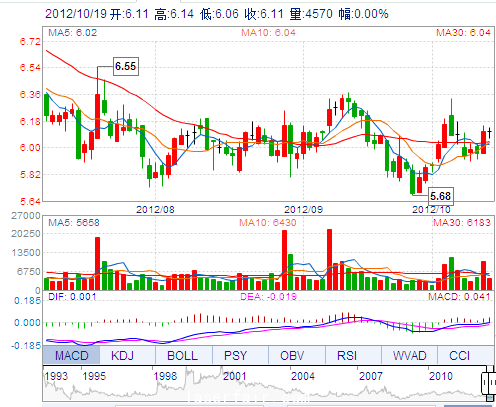 今 开: 6.11 成交量: 4570手 振 幅: 1.31% 最 高: 6.14 成交额: 278.82万 换手率: 0.26% 最 低: 6.06 总市值: 10.61亿 市净率: 2.63 昨 收: 6.11 流通市值: ...