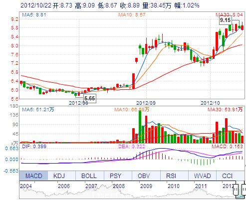 今 开: 8.73 成交量: 384463手 振 幅: 4.77% 最 高: 9.09 成交额: 34132.34万 换手率: 4.06% 最 低: 8.67 总市值: 92.85亿 市净率: 3.30 昨 收: 8.80 流通市...