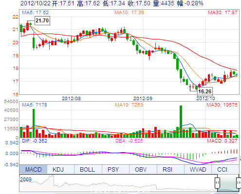 今 开: 17.51 成交量: 4435手 振 幅: 1.60% 最 高: 17.62 成交额: 775.36万 换手率: 0.37% 最 低: 17.34 总市值: 74.76亿 市净率: 5.34 昨 收: 17.55 流通市...