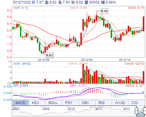 今 开: 7.97 成交量: 90958手 振 幅: 11.47% 最 高: 8.82 成交额: 7739.65万 换手率: 4.68% 最 低: 7.90 总市值: 17.57亿 市净率: 3.59 昨 收: 8.02 流通市值...
