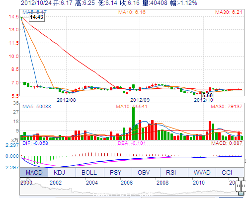 今 开: 6.17 成交量: 40407手 振 幅: 1.77% 最 高: 6.25 成交额: 2498.68万 换手率: 0.45% 最 低: 6.14 总市值: 54.89亿 市净率: 1.06 昨 收: 6.23 流通市值...