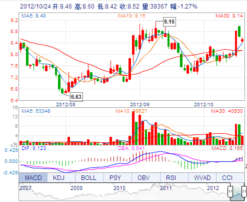 今 开: 8.46 成交量: 39367手 振 幅: 2.09% 最 高: 8.60 成交额: 3344.14万 换手率: 2.03% 最 低: 8.42 总市值: 16.98亿 市净率: 3.42 昨 收: 8.63 流通市值...
