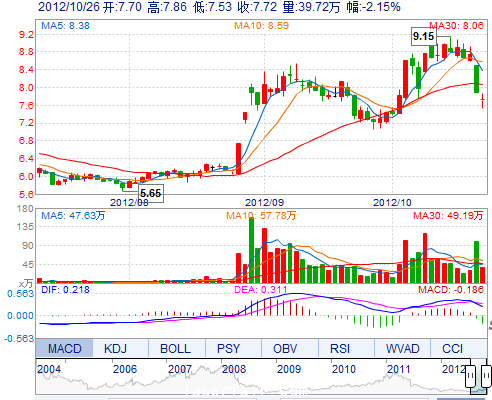 今 开: 7.70 成交量: 397157手 振 幅: 4.18% 最 高: 7.86 成交额: 30583.50万 换手率: 4.20% 最 低: 7.53 总市值: 80.63亿 市净率: 2.49 昨 收: 7.89 流通市...