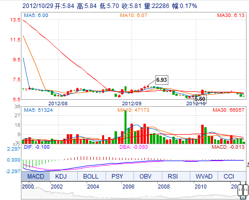 今 开: 5.84 成交量: 22285手 振 幅: 2.41% 最 高: 5.84 成交额: 1284.29万 换手率: 0.25% 最 低: 5.70 总市值: 51.77亿 市净率: 1.00 昨 收: 5.80 流通市值...