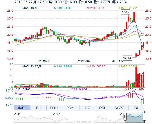 今开: 17.58 成交量: 13.77万手 振幅: 9.98% 最高: 18.60 成交额: 2.46亿元 换手率: 20.30% 最低: 16.83 总市值: 24.79亿 市净率: 3.87 昨收: 17.74 流通市值...