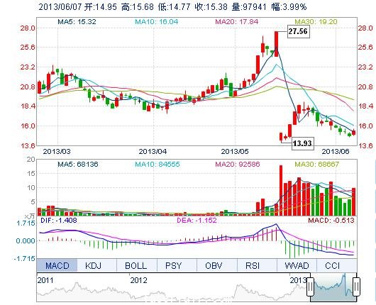 | 今 开: | 14.95 | 成交量: | 9.79万手 | 振 幅: | 6.15% |