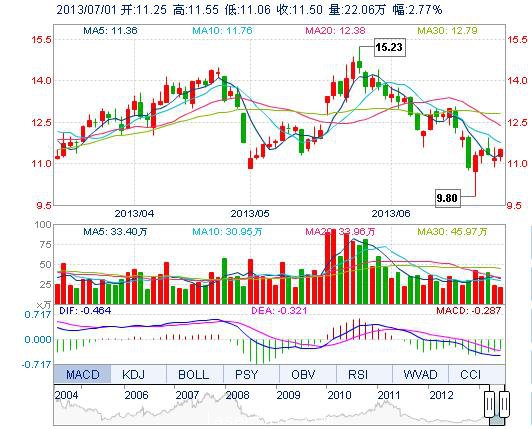今开: 11.25 成交量: 22.06万手 振幅: 4.38% 最高: 11.55 成交额: 2.49亿元 换手率: 2.33% 最低: 11.06 总市值: 120.11亿 市净率: 3.47 昨收: 11.19 流通市值...
