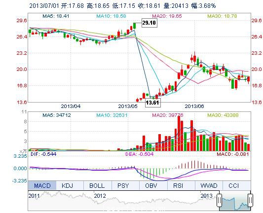 今开: 17.68 成交量: 2.04万手 振幅: 8.36% 最高: 18.65 成交额: 3700.91万元 换手率: 9.49% 最低: 17.15 总市值: 13.03亿 市净率: 2.28 昨收: 17.95 流通市...