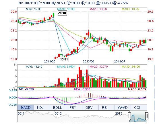今开: 19.80 成交量: 3.40万手 振幅: 7.66% 最高: 20.53 成交额: 6731.43万元 换手率: 15.79% 最低: 19.00 总市值: 13.32亿 市净率: 2.33 昨收: 19.98 流通市...