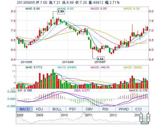 今开: 7.00 成交量: 4.99万手 振幅: 3.14% 最高: 7.21 成交额: 3566.62万元 换手率: 1.82% 最低: 6.99 总市值: 20.52亿 市净率: 3.26 昨收: 7.01 流通市值: ...