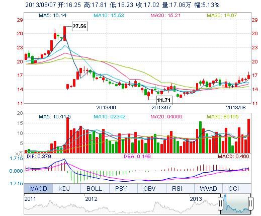 今开: 16.25 成交量: 17.06万手 振幅: 9.76% 最高: 17.81 成交额: 2.95亿元 换手率: 24.91% 最低: 16.23 总市值: 22.81亿 市净率: 7.13 昨收: 16.19 流通市值...