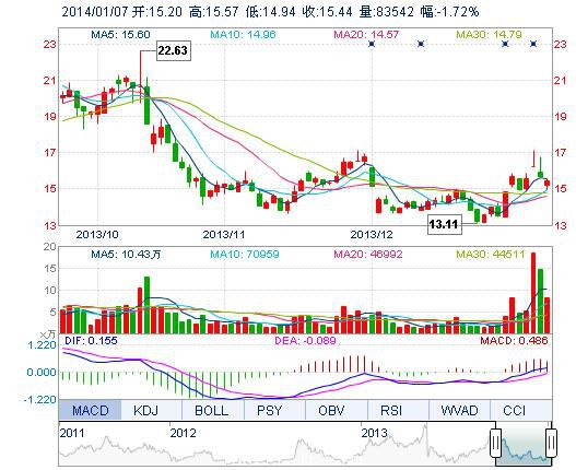 今 开: | 15.20 | 成交量: | 8.35万手 | 振 幅: | 4.01% |