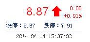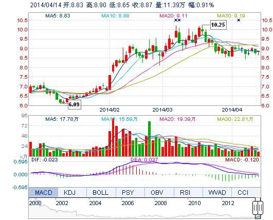 今开: 8.83 成交量: 11.39万手 振幅: 2.84% 最高: 8.90 成交额: 9994.90万元 换手率: 1.28% 最低: 8.65 总市值: 79.04亿 市净率: 2.98 昨收: 8.79 流通市值:...