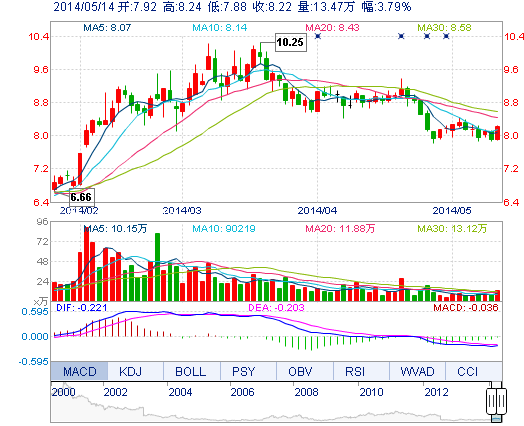 今开: 7.92 成交量: 13.47万手 振幅: 4.55% 最高: 8.24 成交额: 1.09亿元 换手率: 1.51% 最低: 7.88 总市值: 73.25亿 市净率: 2.74 昨收: 7.92 流通市值: 73...