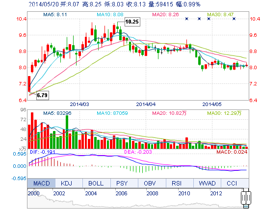 今开: 8.07 成交量: 5.94万手 振幅: 2.74% 最高: 8.25 成交额: 4847.37万元 换手率: 0.67% 最低: 8.03 总市值: 72.45亿 市净率: 2.71 昨收: 8.04 流通市值: ...