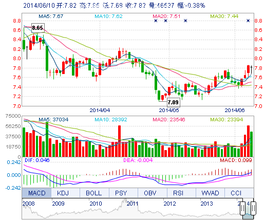 | 最 高: | 7.85 | 成交额: | 3612.75万元 | 换手率: | 1.69% |