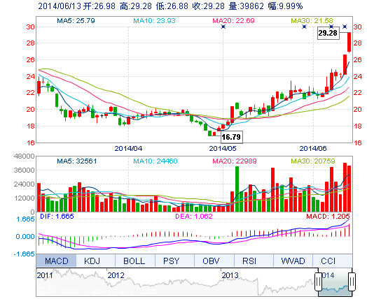 | 最 高: | 29.28 | 成交额: | 1.13亿元 | 换手率: | 14.95% |
