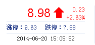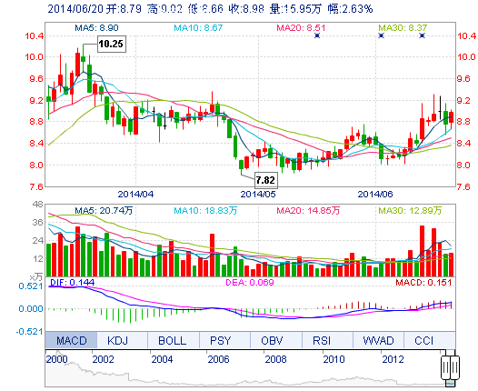 今开: 8.79 成交量: 15.95万手 振幅: 4.11% 最高: 9.02 成交额: 1.42亿元 换手率: 1.79% 最低: 8.66 总市值: 80.02亿 市净率: 2.99 昨收: 8.75 流通市值: 80...